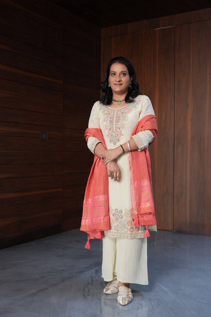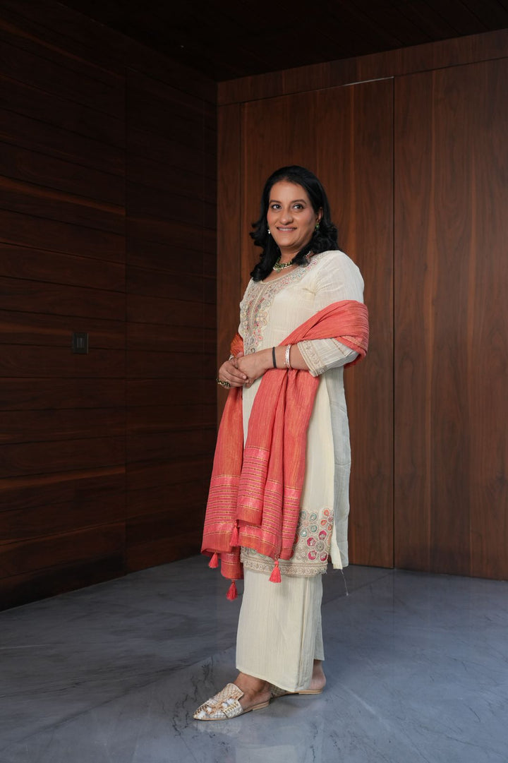 OFF WHITE SUIT WITH PEACH DUPPATTA